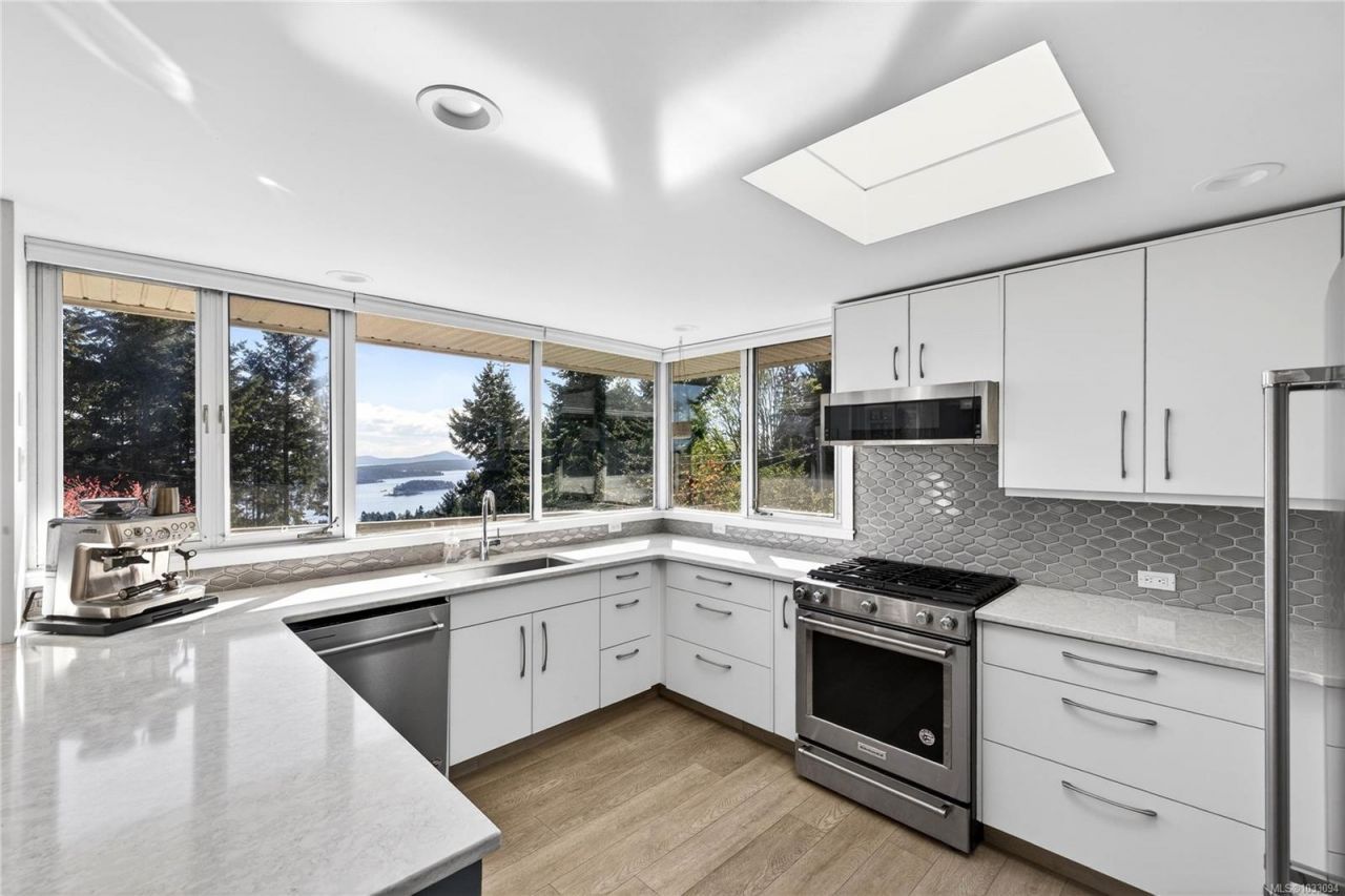 Bathed in natural light from soaring floor-to-ceiling windows and fresh skylights, this 1970s architectural masterpiece has been elegantly reimagined with a sophisticated coastal aesthetic. The interior showcases white wood boat siding, wide-plank flooring, and bright quartz countertops, anchored by a new wood-burning wood stove and premium stainless kitchen appliances. This 0.48-acre mountainside estate offers serene views of Ganges Harbor, the mainland, and Mt. Baker, supported by substantial 2020?2025 upgrades including a new roof, bathrooms, kitchen, floors, fresh paint inside and out, and dual heat pumps. It is connected to Community...read more