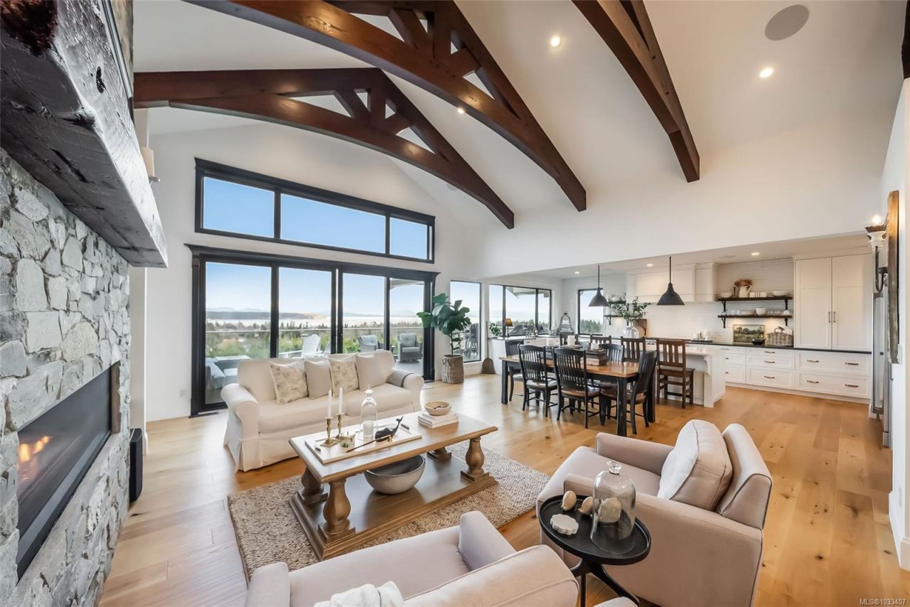 This breathtaking custom-built home with stunning panoramic ocean views was designed with intention and finished to perfection by Twelve Oaks Construction. The living room wows with vaulted ceilings showcasing old-growth custom curved exposed trusses and a sleek linear gas fireplace framed in real stone. The kitchen is a chef's paradise, with a shiplap ceiling, an oversized quartz-topped island, a full-size fridge and freezer, a Wolf six-burner dual-fuel range, a glass-front fridge, and a walk-in pantry. The primary suite feels straight out of a design magazine, featuring a reclaimed brick accent wall that frames the ocean view window, a...read more